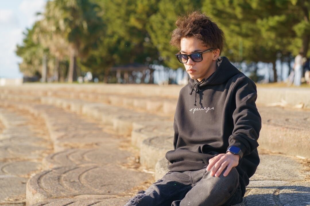 フロントはシンプルなデザイン、バックはフードにシンプルなデザインとなっております!